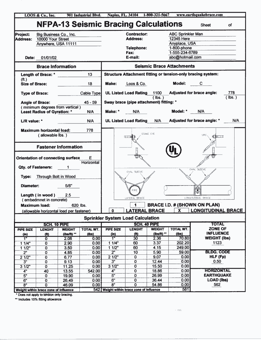 Do NFPA-13 Seismic Bracing Calculations ON LINE using the NFPA-13 Calculation Form. In minutes you will enter project and calculation criteria in 4 easy steps. The result is a completed NFPA-13 Seismic Bracing Calculation Form that you can print out on your printer while you are on line.